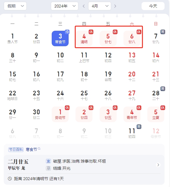 2024年清明節(jié)放假時(shí)間安排: 4月4日(星期四)至4月6日(星期六)放假調(diào)休,共3天。4月7日(星期日)上班。