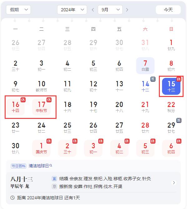 2024年中秋節(jié)放假時(shí)間安排: 9月15日(星期日)至7月17日(星期二)放假調(diào)休,共三天。9月18日(星期三)上班。